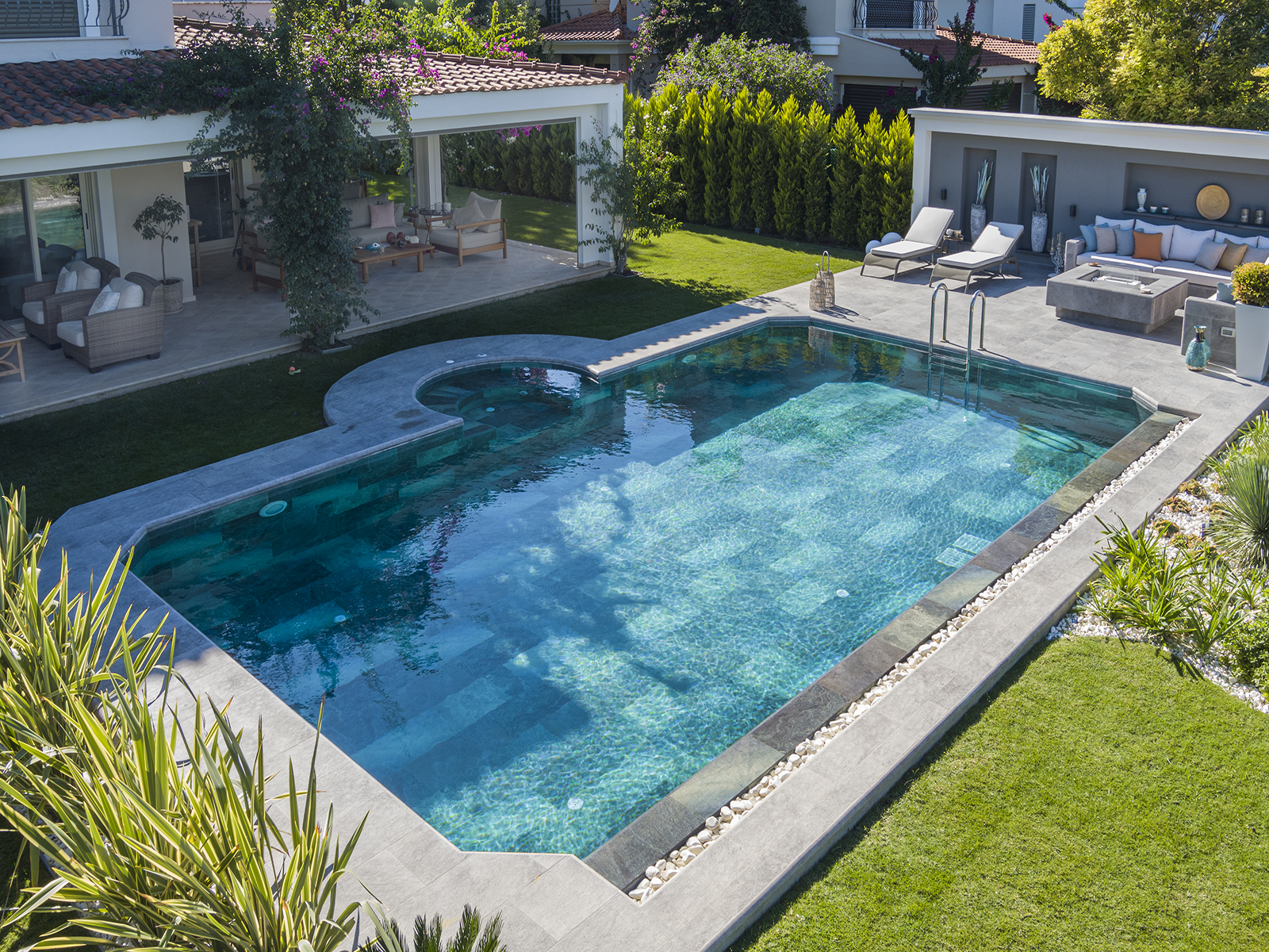 Das in İzmir Çeşme realisierte Projekt vereint modernes Outdoor-Design mit der ästhetischen Stärke der Serapool Porzellanprodukte. Die mit Pool Garden Grey porzellan Terrassenfliesen gestaltete feste Sitzgruppe schafft mit der anspruchsvollen Eleganz der Grautöne einen prestigeträchtigen Lebensraum am Pool. Die Olcay Mix Schwimmbeckenfliesen verleihen dem Schwimmbereich eine frische und ausgewogene Atmosphäre. Dank einer Wasseraufnahme unter 0,5 % ist die Konstruktion langlebig. Hohe Beständigkeit gegen UV-Strahlen, chemische Einflüsse und thermische Schocks sorgt für dauerhaften Outdoor-Komfort. Der Rutschfestigkeitswert von PTV ≥ 45° bietet sowohl Sicherheit als auch eine überlegene Nutzererfahrung. Die feste architektonische Lösung, die das Problem der Lagerung von Gartenmöbeln beseitigt, bietet Bedienkomfort. Es handelt sich um ein ganzheitliches Designkonzept, das nicht nur einen Sitzbereich schafft, sondern durch ästhetische Übergänge harmonisch in die Umgebung integriert ist und ein funktionales sowie luxuriöses Lebensgefühl vermittelt.