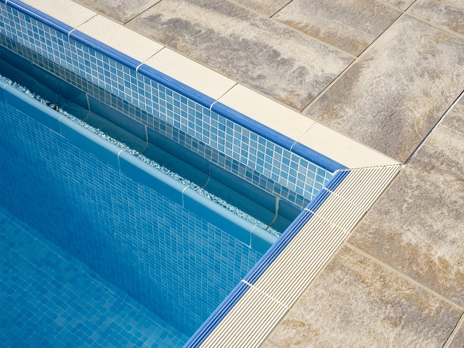 The Arum Barut Collection Hotel Pool Project stands out as an integrated application that combines modern design lines with the harmony of natural textures. The Olcay Mix series used on the pool floor merges green and earthy tones with a natural stone texture, giving the water an elegant depth. Its Low Water Absorption ensures long-lasting use by providing resistance to UV Resistance, chemicals, and thermal shocks. The PTV ≥ 45° Non-slip value supports safety in wet areas. In the transitions, Olcay Mix Scoth Outer Corner and Outer Angle Corner elements ensure both technical and aesthetic integrity, while along the pool edges, Pool Garden Grey flat Petit Carre Copings and flex grating solutions regulate overflow lines, delivering both functionality and visual continuity. Around the pool, Pool Garden Grey Porcelain Anti Slip Terrace Tiles complement the architectural lines of the space with the modern impact of grey tones. The project combines a variety of colors and textures with technical details to offer hotel guests a safe, aesthetic, and comfortable pool experience.