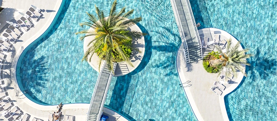 The Arycanda Kirman Premium Hotel Pool Project offers a distinguished application that blends the rich tones of natural colors with modern pool design. The Olcay Mix series used on the pool floor brings depth and a natural vibrancy to the water through balanced transitions of green, blue, and earthy tones. Its Low Water Absorption ensures long-lasting use by providing high resistance to UV Resistance, chemicals, and thermal shocks. The PTV ≥ 45° Non-slip value creates a safe swimming experience. Along the pool edges, the Pool Garden Beige flex grating system organizes the overflow lines, delivering both technical functionality and visual continuity. The warm effect of beige tones forms a harmonious contrast with the natural color palette of Olcay Mix, enhancing the architectural integrity of the space. The project combines color and texture harmony with functional details to offer hotel guests a safe, aesthetic, and comfortable pool experience.
