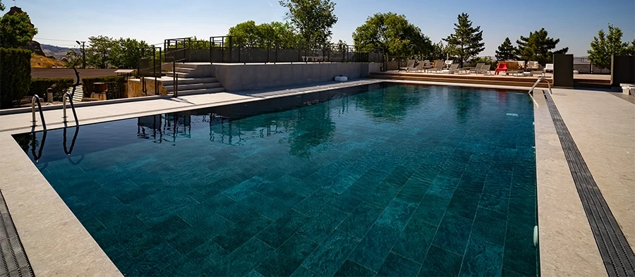 The Cappadocia Kaya Camping Hotel Pool features Verde Guatemala Porcelain Pool Tiles, adding both a sophisticated and natural depth to the water. With its rich tones of deep green, the series harmonizes with the region’s unique landscape while creating a dynamic atmosphere through ever-changing reflections of light on the water’s surface. The natural stone-inspired texture of Verde Guatemala provides a strong aesthetic statement while ensuring long-lasting performance. Made from 100% porcelain, the collection enhances the project not only with its visual integrity but also with its technical durability. Its naturally textured Anti-slip design creates elegant transitions when light meets the water, offering users a Safe swimming experience. With Low Water Absorption and high resistance to UV Rays, Chemicals, and challenging weather conditions, these tiles extend the pool’s lifespan and ensure hygienic use.
