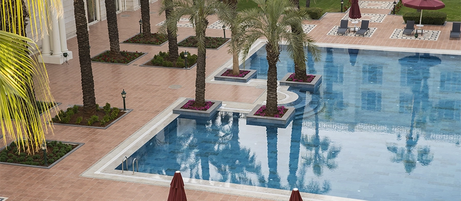 Located in Antalya, IC Hotels Airport complements its contemporary architectural lines with Serapool’s innovative porcelain solutions. The Marin Series used on the pool interior adds a natural sense of freshness to the water with its elegant turquoise tones. Functionality is enhanced with the use of Petit Carre Copings at the edge transitions, while surface integrity is achieved with Marin Outer Trim. All surfaces feature a water absorption rate below 0.5%, ensuring long-term durability. The tiles demonstrate high resistance to UV rays, chemicals, and thermal shocks. Pool Garden Beige Anti Slip Terrace Tiles and stair non-slip elements preserve aesthetic coherence while supporting safety. This project not only offers a swimming area but also redefines the luxury living experience through the seamless integration of aesthetics, safety, and comfort.