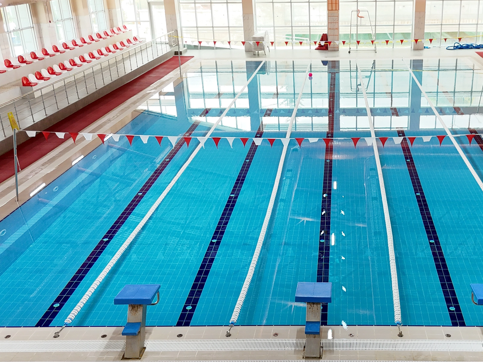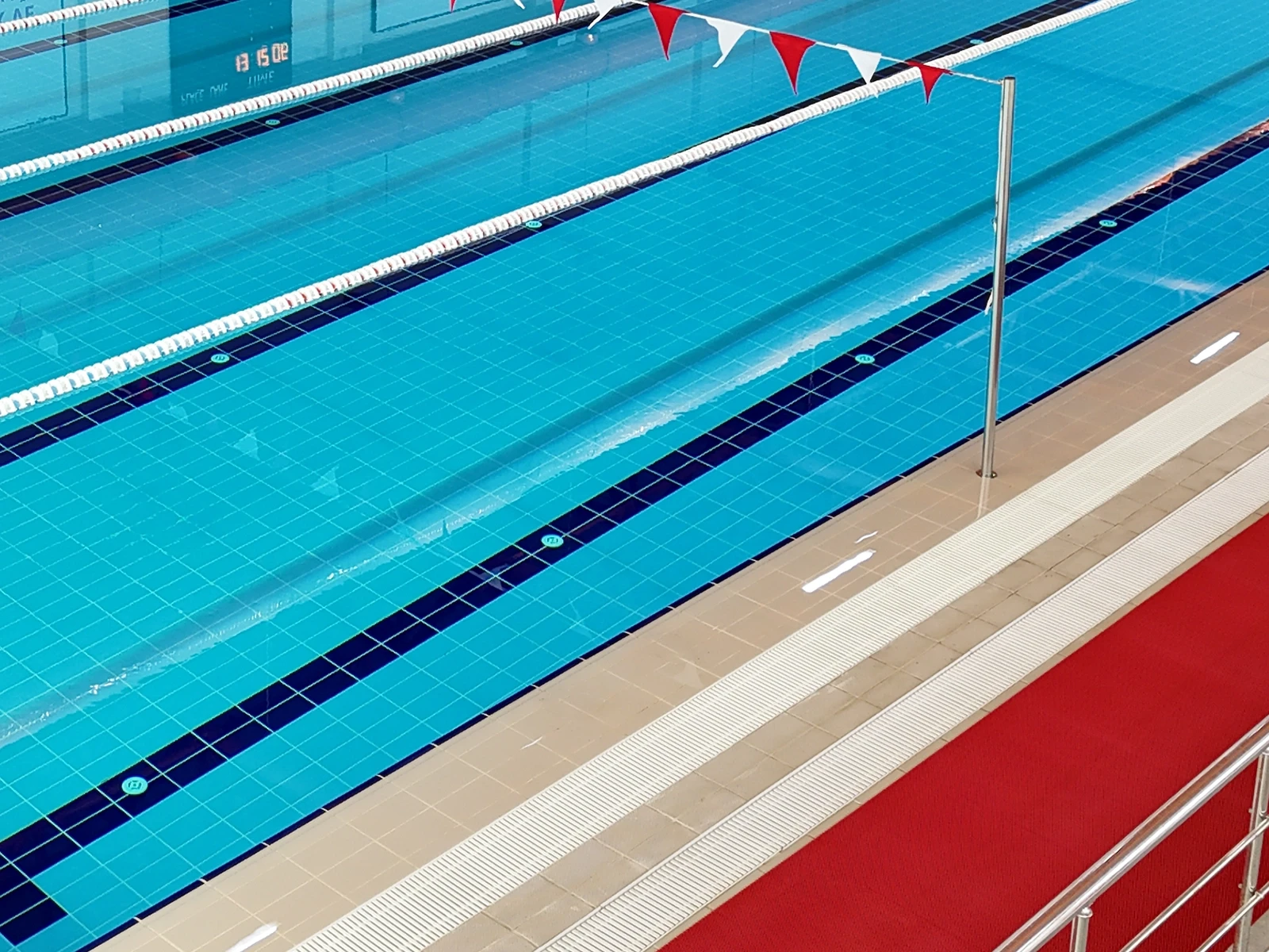 In the Ankara Elmadağ District Directorate of Youth and Sports Semi-Olympic Swimming Pool project, the Universal Series Porcelain Pool Tiles were applied. With a non-porous structure and a water absorption rate below 0.5%, the pool tiles contribute to maintaining hygiene while offering high resistance to frost, chemicals, and intensive use. On the pool edges, the Novita Pool Coping provides athletes with a secure grip thanks to its ergonomic form and anti-slip finish. The Novita Series Anti Slip Tile, with a slip resistance value of PTV ≥ 55°, creates safe movement areas on wet surfaces. Its minimal joint structure ensures both ease of installation and hygienic advantages. All products used in the pool are supported by international quality certifications, ensuring a safe and sustainable swimming experience where athletes can fully focus on their performance.