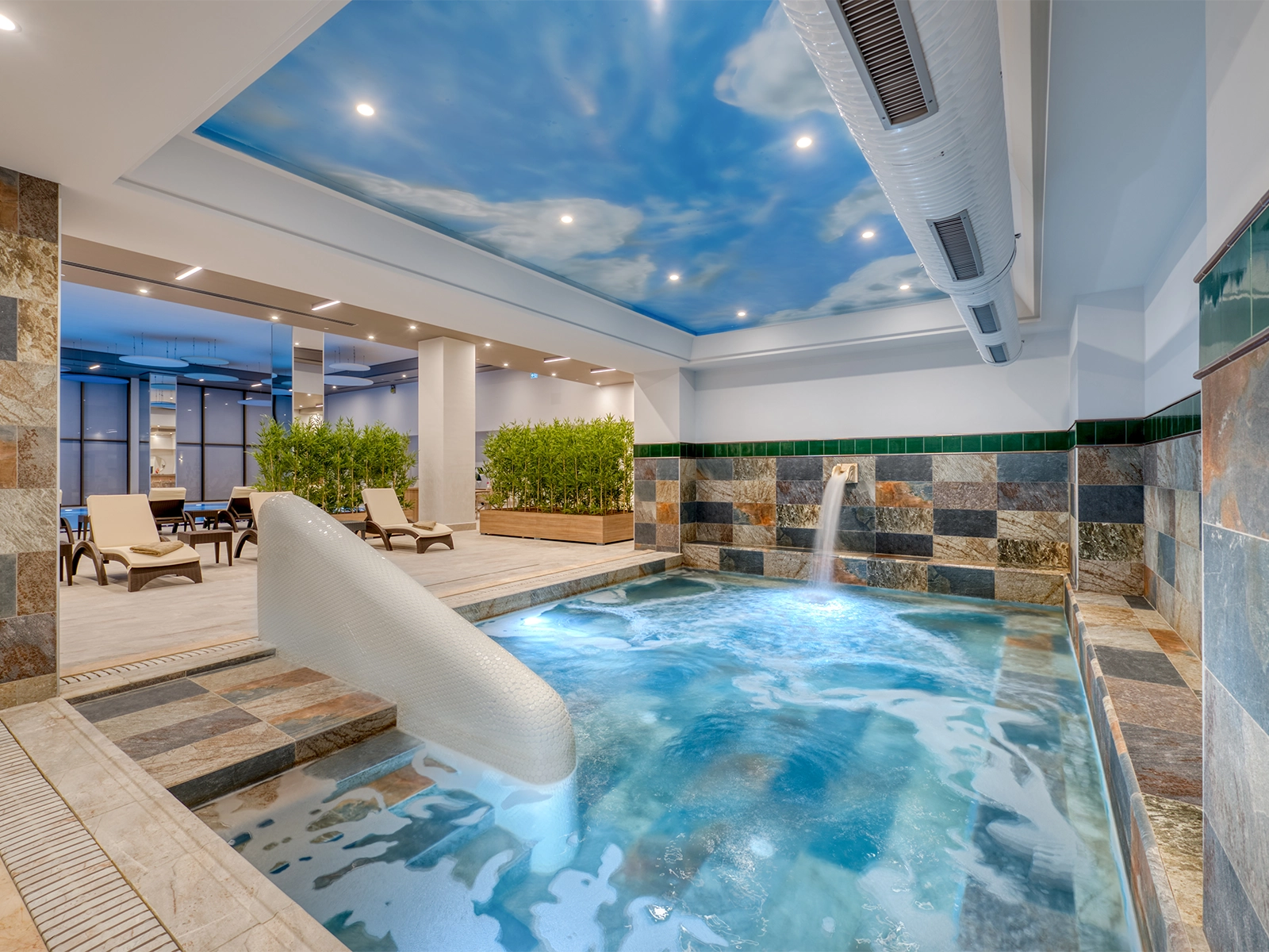 Located in Mersin, BN Hotel Thermal & SPA blends contemporary architectural elegance with Serapool’s refined porcelain solutions. The Pool Mix series creates a natural color transition within the water, bringing a serene and sophisticated atmosphere to the swimming area. Beige Stone porcelain terrace tiles ensure a smooth integration with the surrounding landscape. All surfaces feature a low water absorption rate below 0.5%, providing exceptional durability under thermal conditions. They also offer high resistance to UV rays, chemicals, and thermal shock. Universal series profiled non-slip tiles enhance safety with a PTV ≥ 45° rating. Complementary products such as terrace tiles, pool copings, stair non-slip elements, and PVC grates elevate the comfort and functionality of the overall experience.
