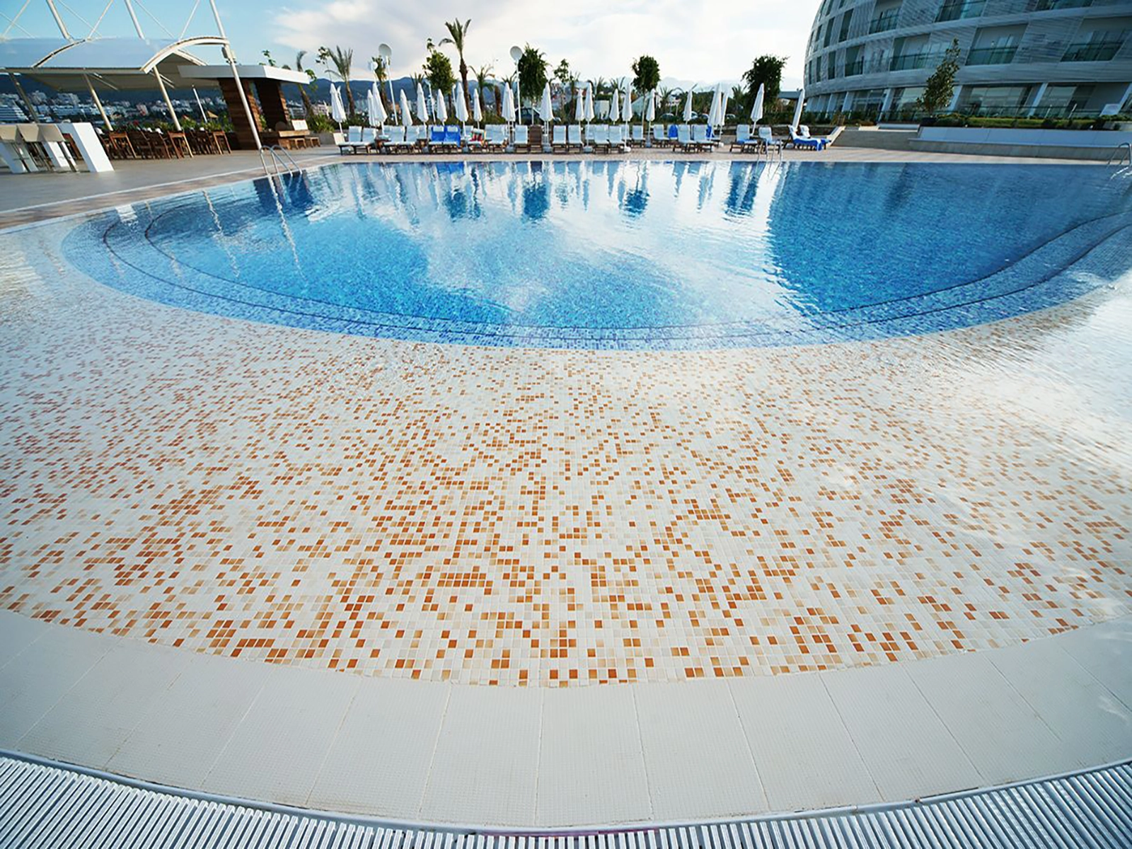 El Gold Island Hotel, ubicado en la costa del Mediterráneo y destacado por su arquitectura única, establece una armonía estética con el lenguaje refinado de los porcelánicos Serapool. Los mosaicos porcelánicos de la serie Olímpica, con transiciones de azul marino y turquesa, transmiten la profundidad del mar al agua; las reflecciones en la superficie que interactúan con la luz del día aportan un dinamismo visual a la piscina. Su textura mate y natural crea un ambiente tranquilo y equilibrado en el espacio al contacto con el agua. Las superficies, con una tasa de absorción de agua inferior al 0,5%, ofrecen durabilidad a lo largo de los años. Presentan alta resistencia a los rayos UV, a productos químicos y a choques térmicos. Gracias al valor antideslizante PTV ≥ 45°, se garantiza un uso seguro. Estos mosaicos especiales, resistentes a arañazos y manchas, contribuyen a la integridad estética del hotel y facilitan su mantenimiento. El diseño exclusivo de la piscina en el proyecto ofrece a los huéspedes no solo un área para nadar, sino una experiencia integral que combina coherencia arquitectónica, seguridad en las superficies y un estándar de vida distinguido.