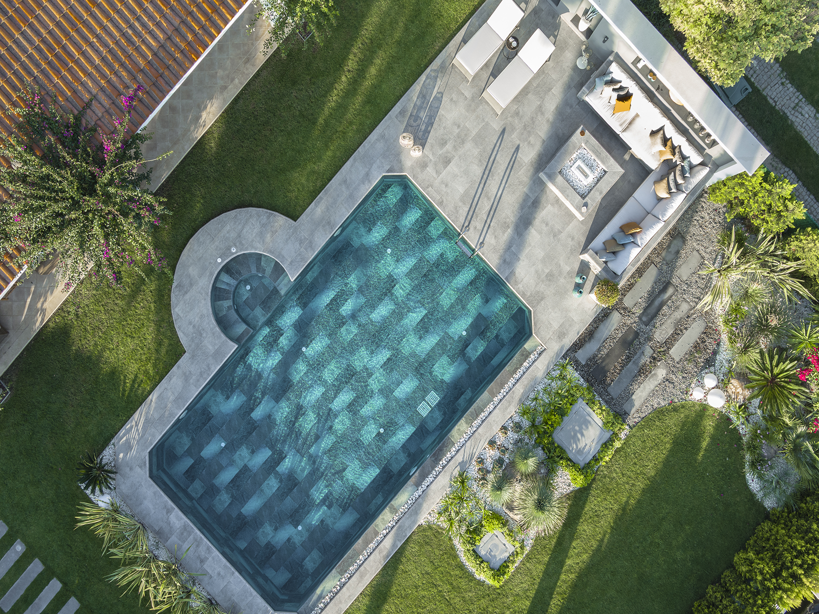 Réalisé à Çeşme, İzmir, ce projet associe un aménagement extérieur contemporain à la puissance esthétique des produits en porcelaine Serapool. Le salon fixe conçu avec les carreaux de terrasse en porcelaine Pool Garden Grey crée un espace de vie prestigieux au bord de la piscine grâce à l’élégance sophistiquée de ses tons gris. Le carreaux de piscine Olcay Mix apporte à la zone de baignade une atmosphère fraîche et équilibrée. Grâce à un taux d’absorption d’eau inférieur à 0,5 %, la structure offre une longévité optimale. Une haute résistance aux rayons UV, aux produits chimiques et aux chocs thermiques assure un confort extérieur constant. Avec une valeur antidérapante PTV ≥ 45°, la surface garantit à la fois sécurité et qualité d’expérience utilisateur. La solution architecturale fixe élimine les problèmes de rangement des meubles de jardin et offre une facilité d’usage. Ce projet met en avant une approche de conception globale, offrant bien plus qu’un simple espace d’assise : un cadre de vie fonctionnel et luxueux en parfaite harmonie avec son environnement.