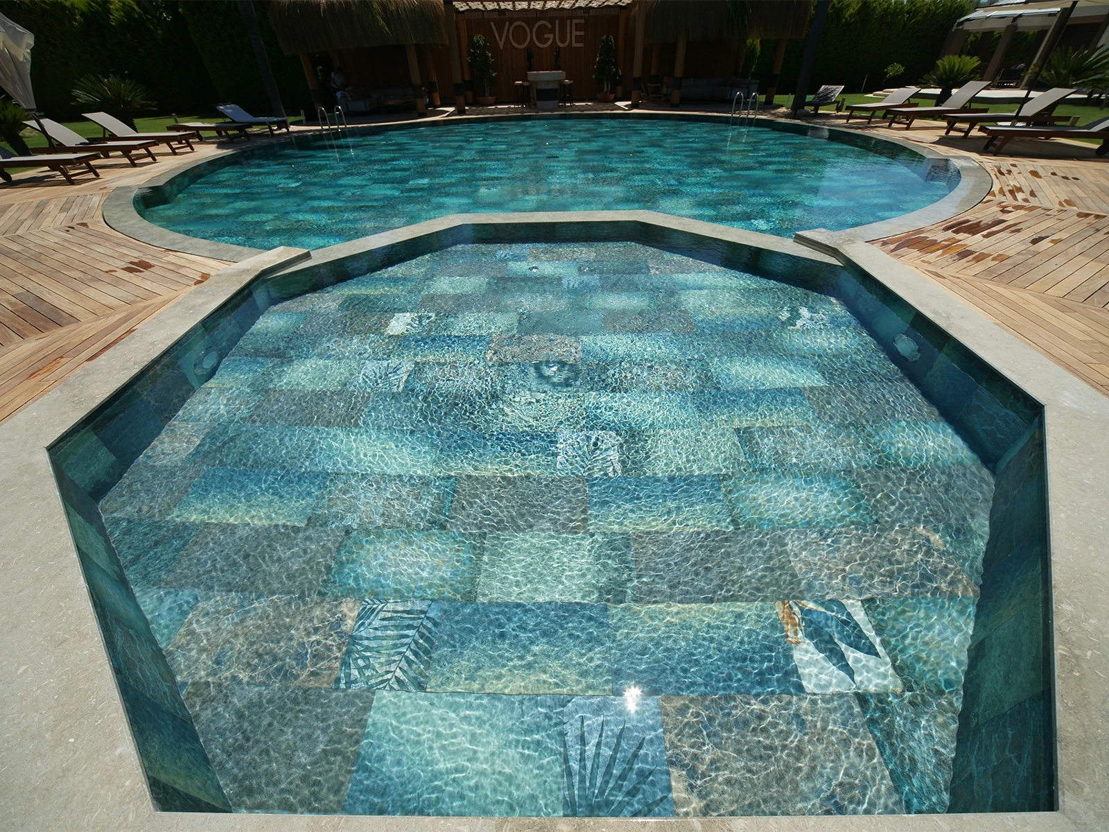 Olcay Mix Serisi ile tasarlanan İzmir Vogue Sitesi havuzu doğal taşların damar desenlerini tropikal bitki figürleriyle bir araya getirerek özgün bir kimlik kazanıyor. Yalnızca estetik açıdan değil fonksiyonel açıdan da dikkat çeken proje Serapool %100 porselen havuz içi karoların düşük su emme oranı ve yüksek kaymazlık değerleri sayesinde hem uzun ömürlü hem de güvenli bir kullanım sunuyor. Tropic Serisi’nin doğayı çağrıştıran motifleriyle birlikte havuz, günün her saatinde ferahlatıcı ve egzotik bir atmosfer yaratıyor.