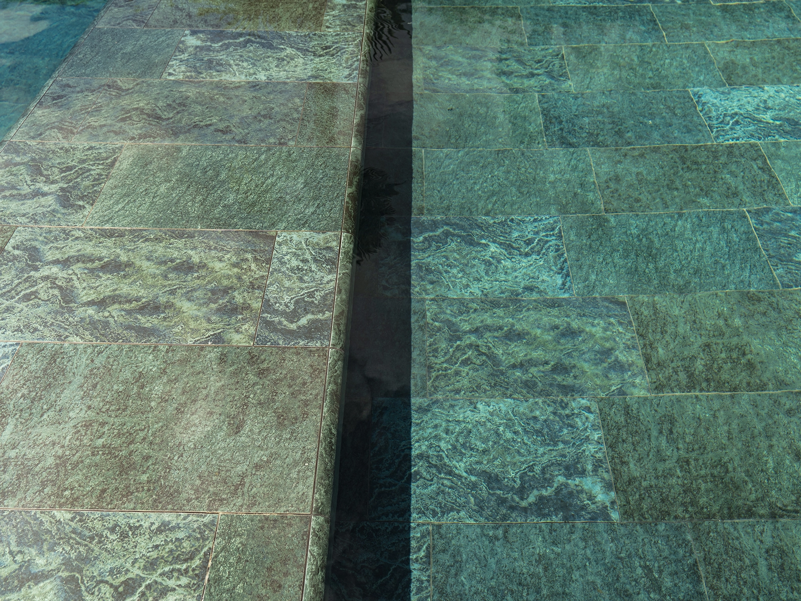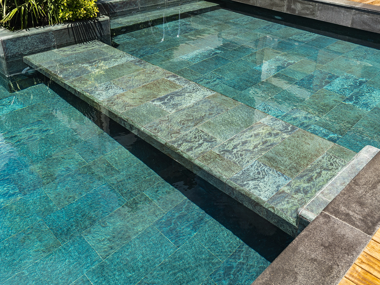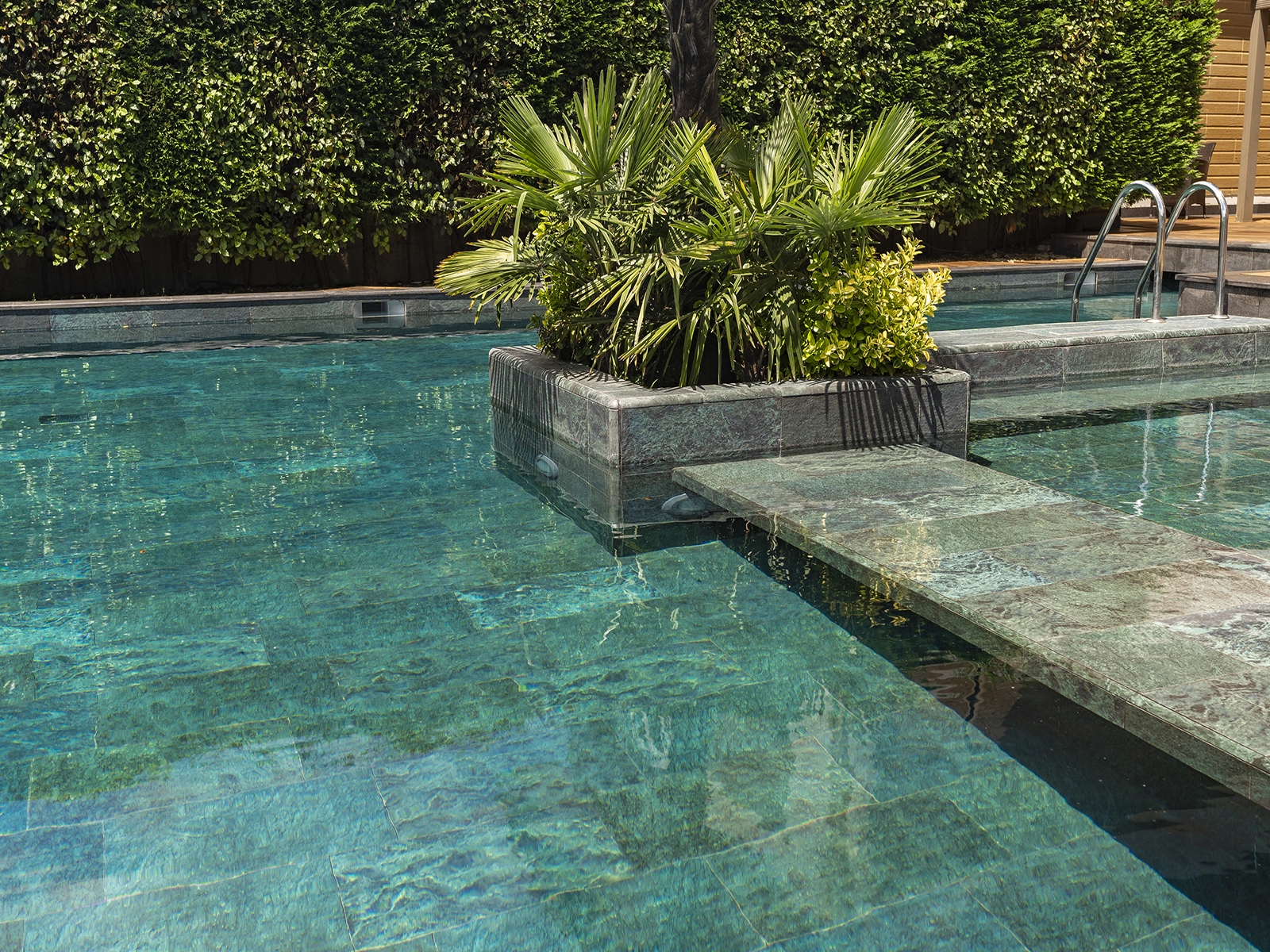 İstanbul’un seçkin yerleşimlerinden Acarkent Sitesi’nde konumlanan özel konut projesi, çağdaş mimariyi Serapool’un doğal taş dokulu porselen karolarıyla buluşturuyor. Verde Guatemala serisi, yeşilin zengin ve koyu tonlarıyla suya derinlik katıyor. Canlı dokusu, havuz alanına doğayla bütünleşen bir atmosfer kazandırıyor. %100 porselen yapısıyla karoların su emme oranı %0,5’in altında kalıyor. UV ışınlarına, kimyasal etkilere ve termal şoklara karşı yüksek dayanım sunuyor. PTV ≥ 45° kaymazlık değeri sayesinde ıslak alanlarda maksimum güvenlik sağlanıyor. Verde Guatemala dışbükey, kenar geçişlerinde hem estetik süreklilik hem de kullanım konforu sunuyor.