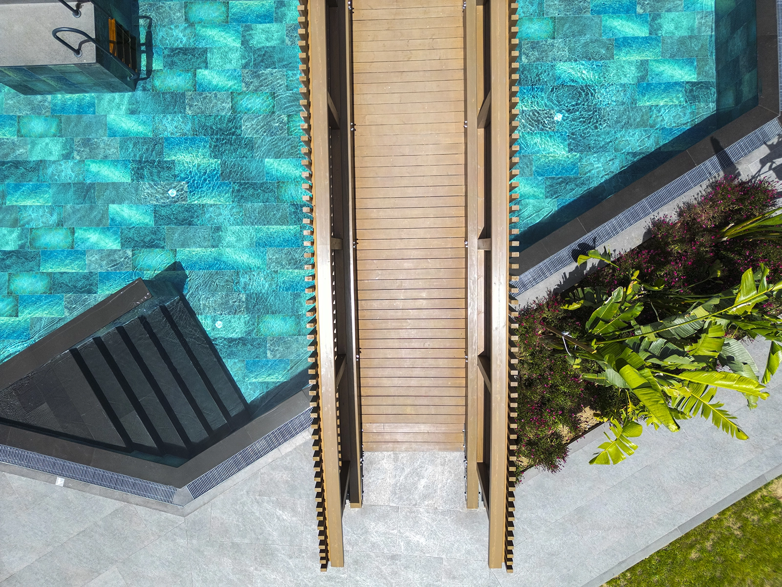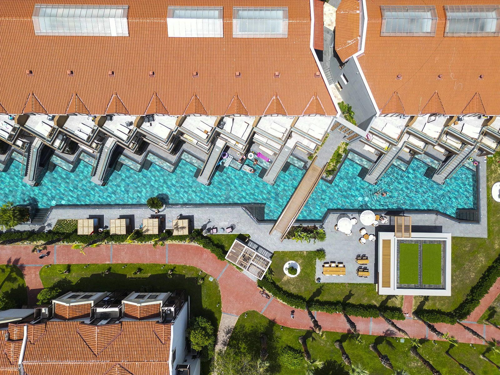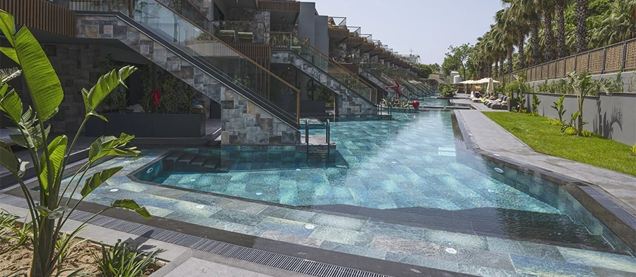 Fethiye’de yer alan Club Tuana Otel doğayla iç içe mimari yapısını Serapool’un estetik çözümleriyle tamamlıyor. Havuz zemininde kullanılan Marin Serisi suyun tonlarını berrak ve canlı şekilde yansıtıyor. Havuz çevresinde tercih edilen Olcay Mix Serisi ise doğal taş görünümüyle zamansız bir zarafet sunuyor. Tüm ürünler %0,5’in altında su emme oranı sayesinde maksimum dayanıklılık gösteriyor. UV ışınlarına, kimyasal maddelere ve ani ısı değişimlerine karşı direnç sağlıyor. Kaymazlık değeri PTV ≥ 45 olan yüzey yapısı, kullanıcı güvenliğini artırıyor. Bu uygulama, sadece bir yüzme alanı değil; estetik, güvenlik ve konforun kusursuz bir bileşimini sunarak lüks yaşam deneyimini tamamlıyor.