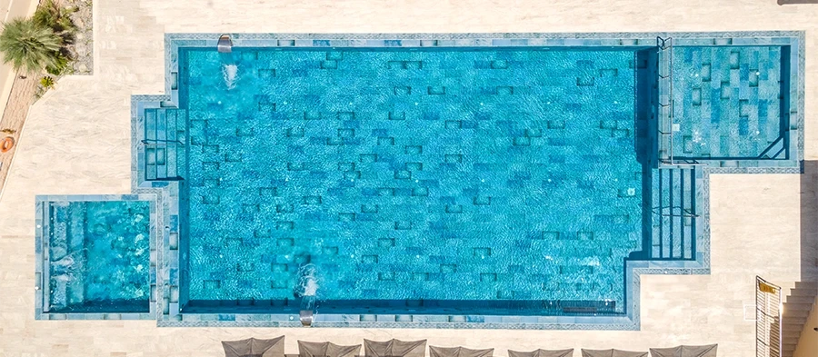 Kamer Exclusive Hotel Suites havuz projesinde kullanılan Blue Bead karo serisi havuza derinlik katan doğal bir mavi ton oluşturuyor. Serideki karoların PTV ≥ 45° kaymazlık değeri, konuklara ıslak yüzeyde güvenli kullanım deneyimi sunuyor. %100 porselen malzemeye sahip olan havuz karoları %0.5’in altında su emme oranıyla havuz içinde ve çevresinde hijyen sağlıyor. Dokulu ve kaymaz yüzeye sahip olan Blue Bead havuz karoları kullanım konforu kadar güvenliği sunuyor. Otelin havuz projesinin detayları Blue Bead dışbükey köşe parçalarla tamamlanıyor. Serapool Blue Bead dışbükey köşe havuzun dış köşe birleşim noktalarında pürüzsüz ve güvenli bir yapı oluşturuyor. Blue Bead dışbükey ayak ise dışbükey parçalarla birlikte kullanılarak havuzun köşe, dönüş ve taban gibi birleşim noktalarında görsel bütünlüğü sağlıyor ve havuzda güvenli geçiş sunuyor.