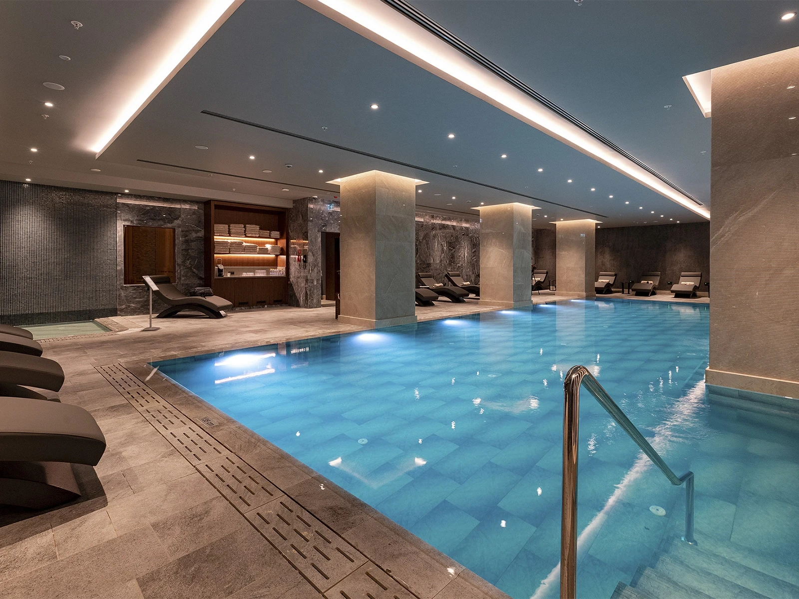 Marriott Hotel İzmir’in seçkin atmosferini tamamlayan havuz projesi modern tasarımı ve fonksiyonel detaylarıyla öne çıkıyor. Hem açık terasta deniz manzarasına karşı konumlanan sonsuzluk etkili havuz hem de otel içindeki şık spa havuzu, misafirlere farklı mekânlarda benzersiz deneyimler sunuyor. Projede kullanılan Olcay Mix Serisi porselen karolar doğal taşın estetik dokusunu suyun berraklığıyla buluşturarak havuzlara sofistike bir karakter kazandırıyor. İç ve dış mekânlarda kullanılan Antique Grey dışbükey parçalar, köşe ve ayak çözümleriyle bütünlük sağlarken havuz kenarlarında tercih edilen Pool Garden Grey tutamak ve monoblok ızgara ürünleri, güvenlik ve hijyen standartlarını en üst seviyeye çıkarıyor.
