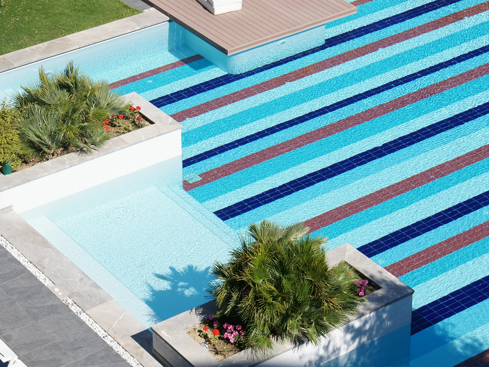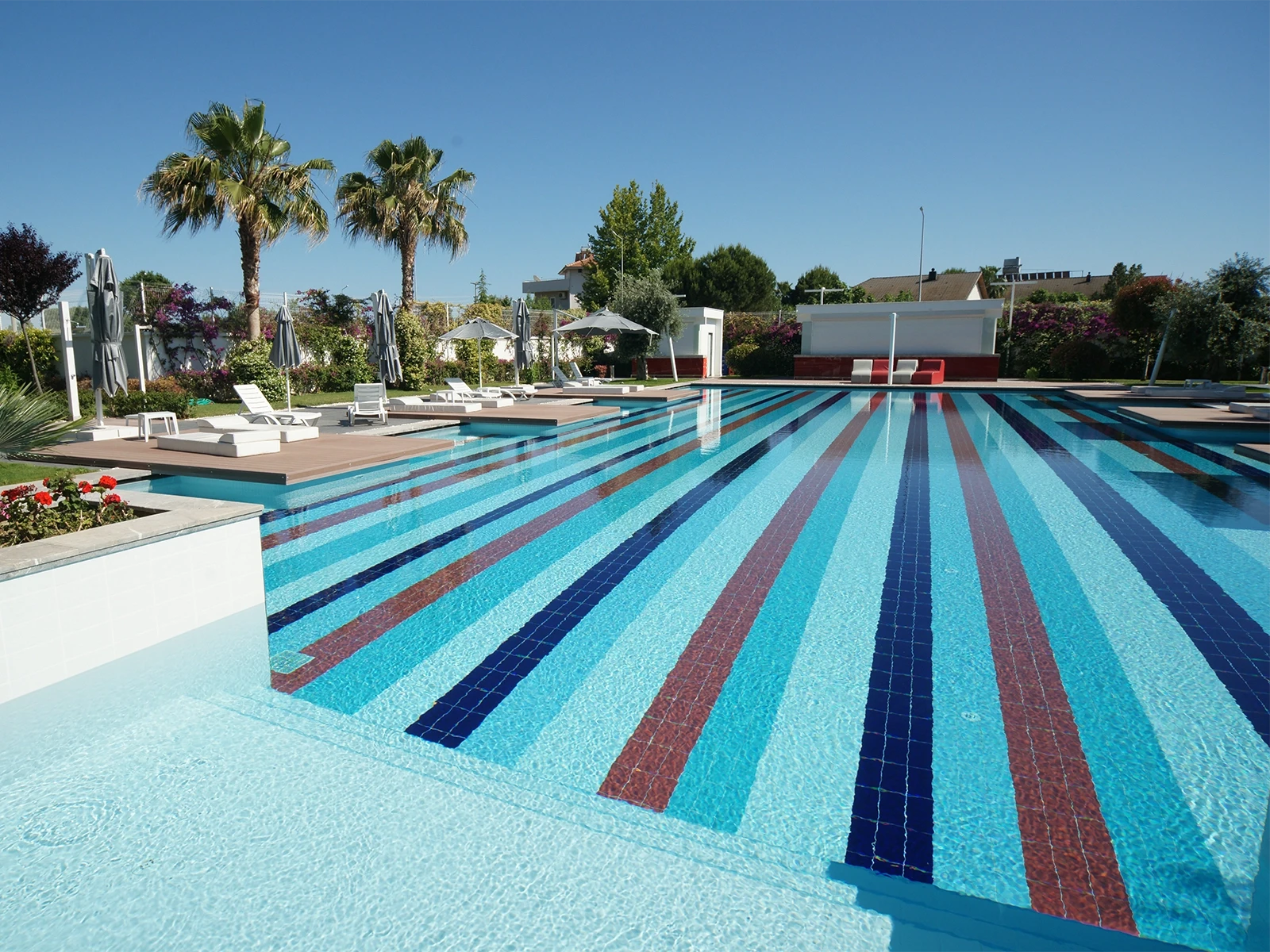 Q Spa Resort’un havuzu sadece yüzmek için değil suyun içinde geçirilen her anı keyifli hale getirmek için tasarlanmış bir alan. Havuzda kullanılan olimpik seri porselen havuz karoları mavi, beyaz ve bordo tonlarıyla canlı bir ritim yaratıyor. Havuz kenar noktaları için kullanılan porselen dışbükey parçalar ve köşe parçalar hem estetik görünümü tamamlıyor hem de havuzda keskin kenarları yumuşatarak güvenliği sağlıyor.