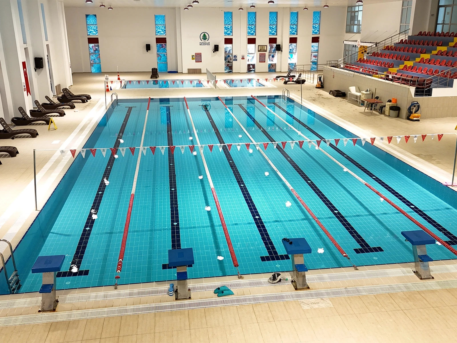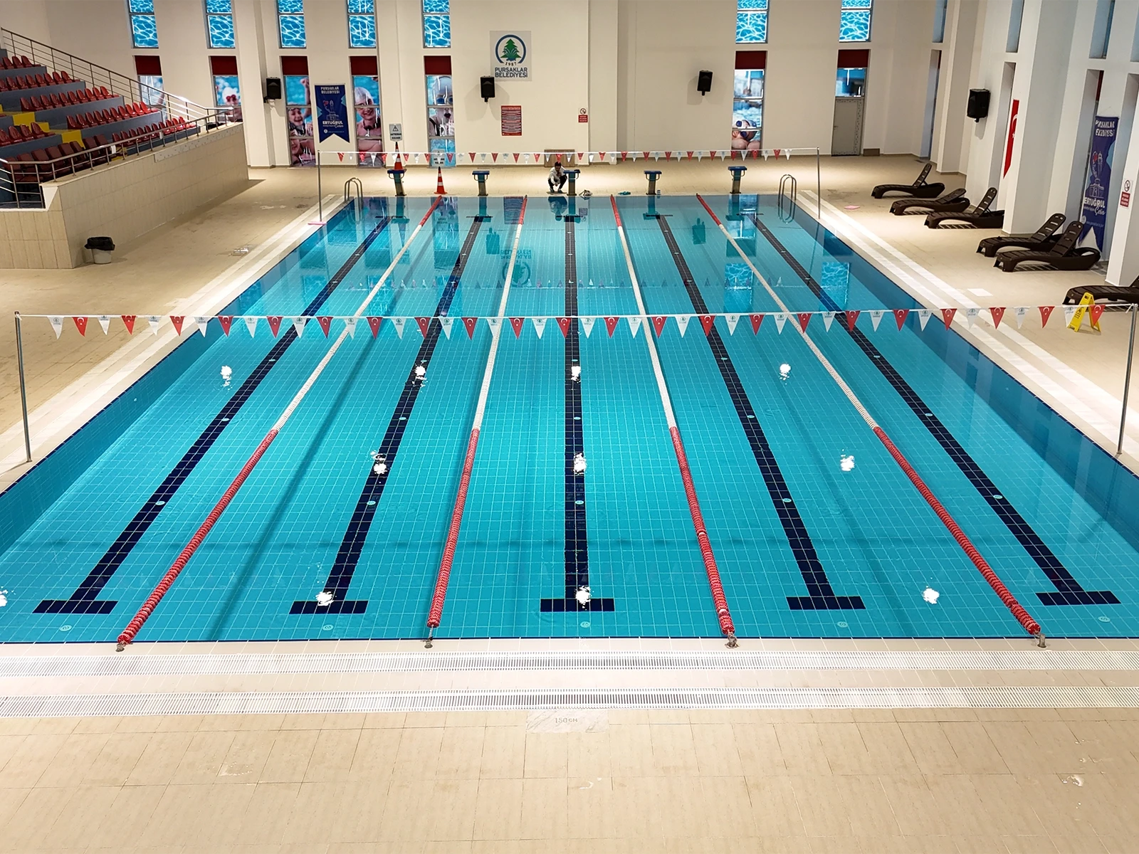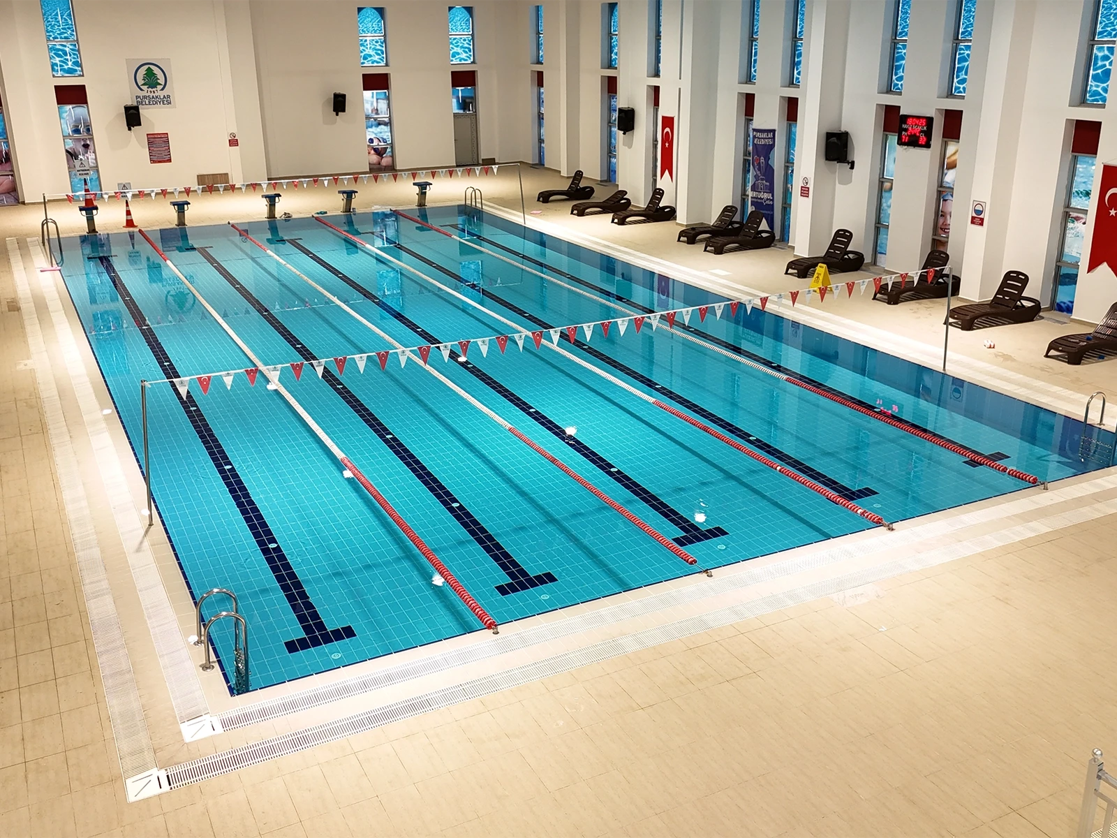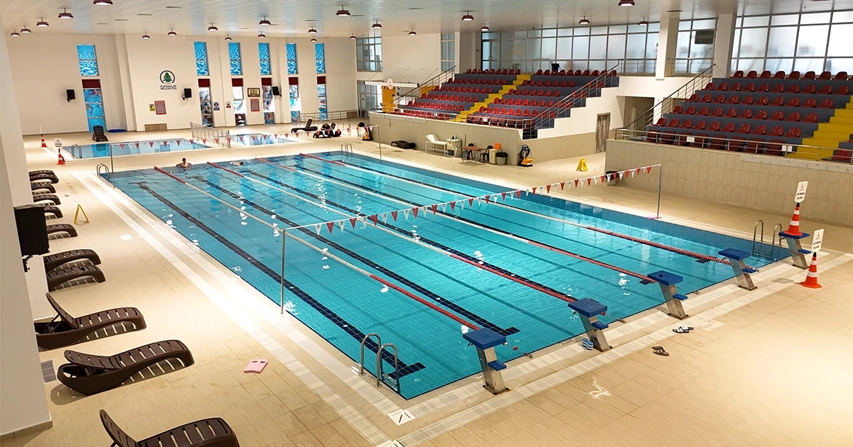 Pursaklar Belediyesi Sosyal Tesisleri’nde yer alan 5 kulvarlı kapalı yarı olimpik yüzme havuzu projesinde Serapool Novita Seri havuz tutamağı, Novita Seri kaymaz karo ve Universal Seri porselen havuz karosu tercih edildi. Novita Seri ürün grubu çift taraflı kaymazlık özelliğiyle hem havuz içi hem havuz dışı kullanımda güvenliği artırırken minimal derz yapısıyla hijyen standardını yükseltiyor. Universal Seri porselen havuz karosu ise düşük su emme oranı ve dona dayanıklı yapısıyla yoğun kullanıma uygun, uzun ömürlü bir çözüm sunuyor. Zengin renk seçenekleri sayesinde kulvar ayrımlarında netlik sağlanırken mekana da estetik bir düzen kazandırılıyor.
