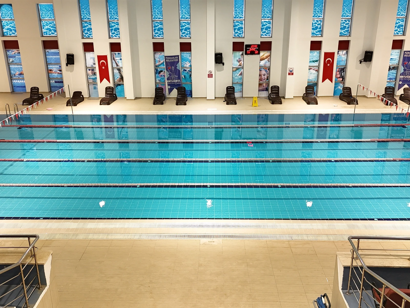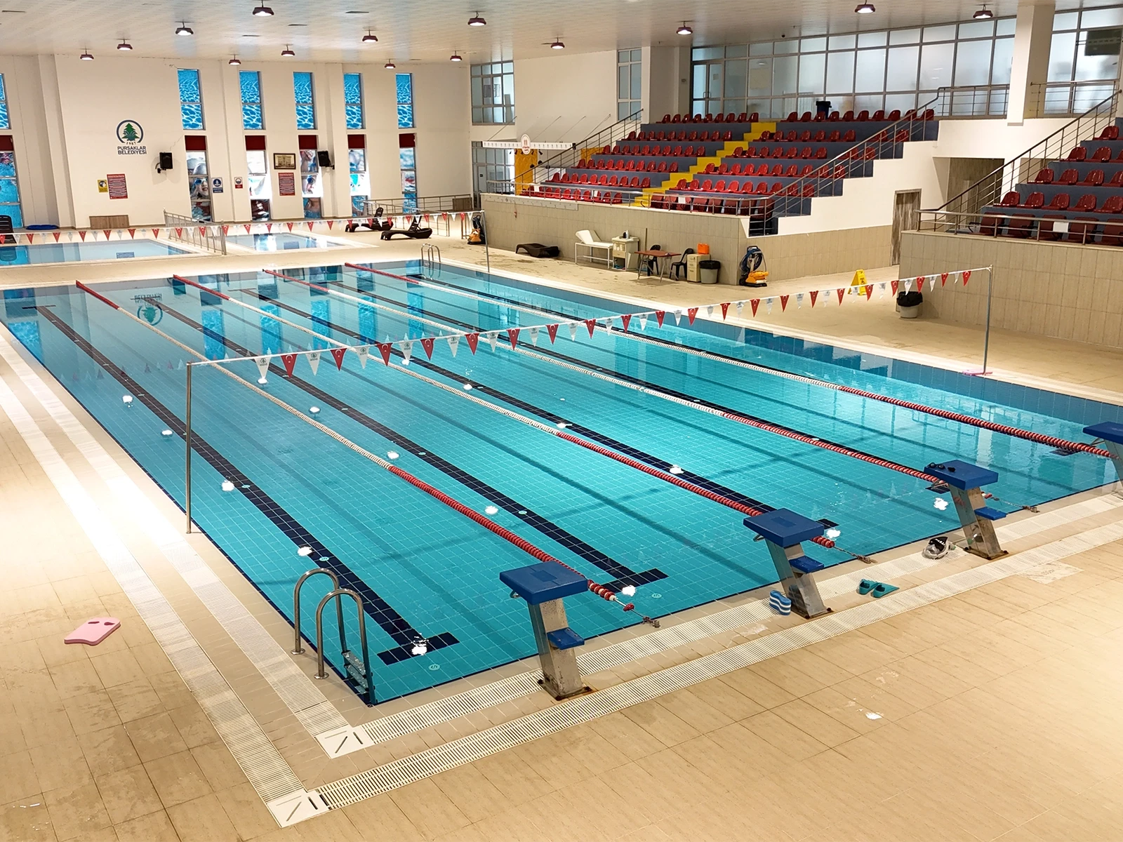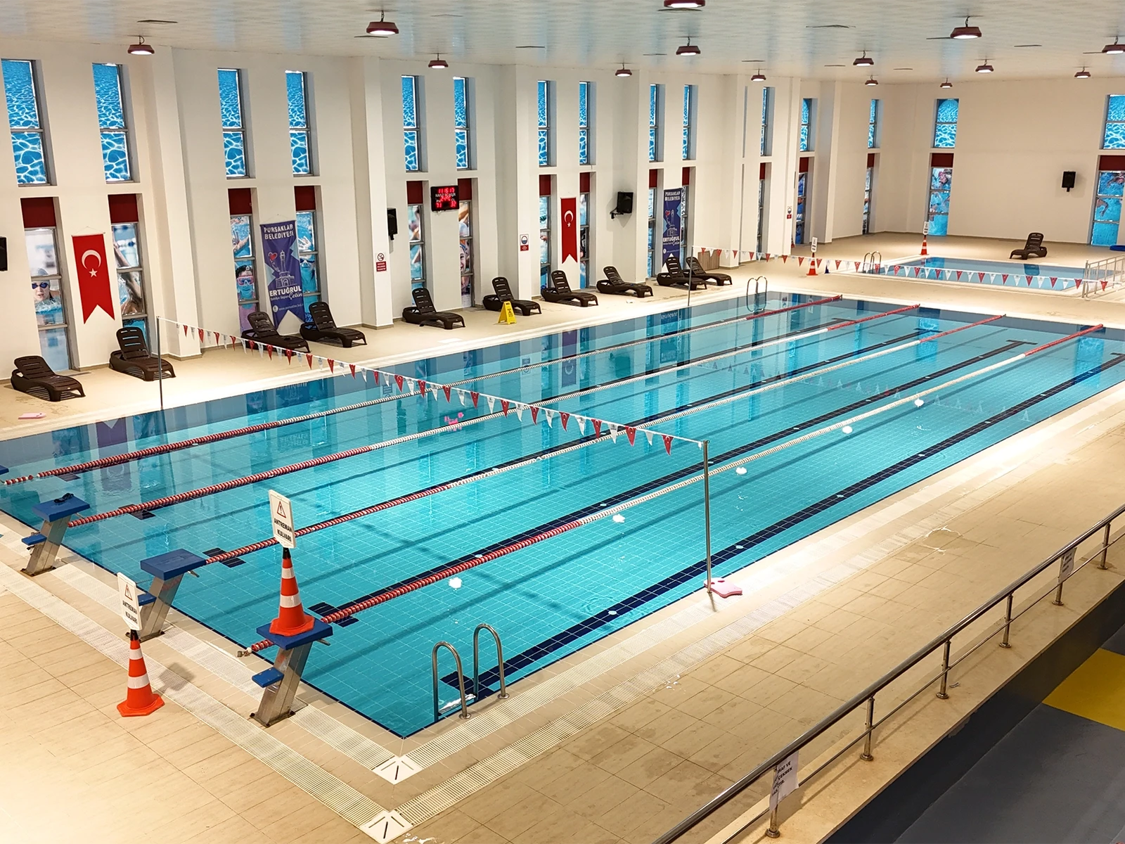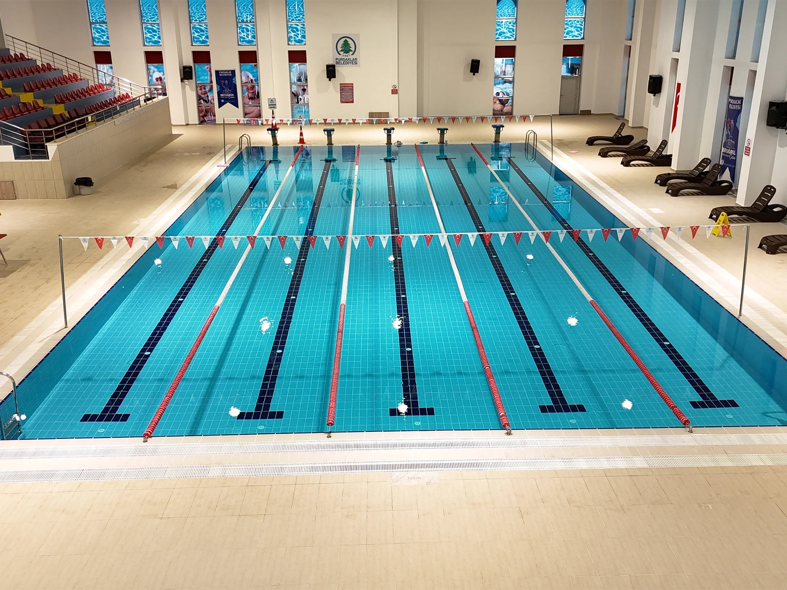 Pursaklar Belediyesi Sosyal Tesisleri’nde yer alan 5 kulvarlı kapalı yarı olimpik yüzme havuzu projesinde Serapool Novita Seri havuz tutamağı, Novita Seri kaymaz karo ve Universal Seri porselen havuz karosu tercih edildi. Novita Seri ürün grubu çift taraflı kaymazlık özelliğiyle hem havuz içi hem havuz dışı kullanımda güvenliği artırırken minimal derz yapısıyla hijyen standardını yükseltiyor. Universal Seri porselen havuz karosu ise düşük su emme oranı ve dona dayanıklı yapısıyla yoğun kullanıma uygun, uzun ömürlü bir çözüm sunuyor. Zengin renk seçenekleri sayesinde kulvar ayrımlarında netlik sağlanırken mekana da estetik bir düzen kazandırılıyor.