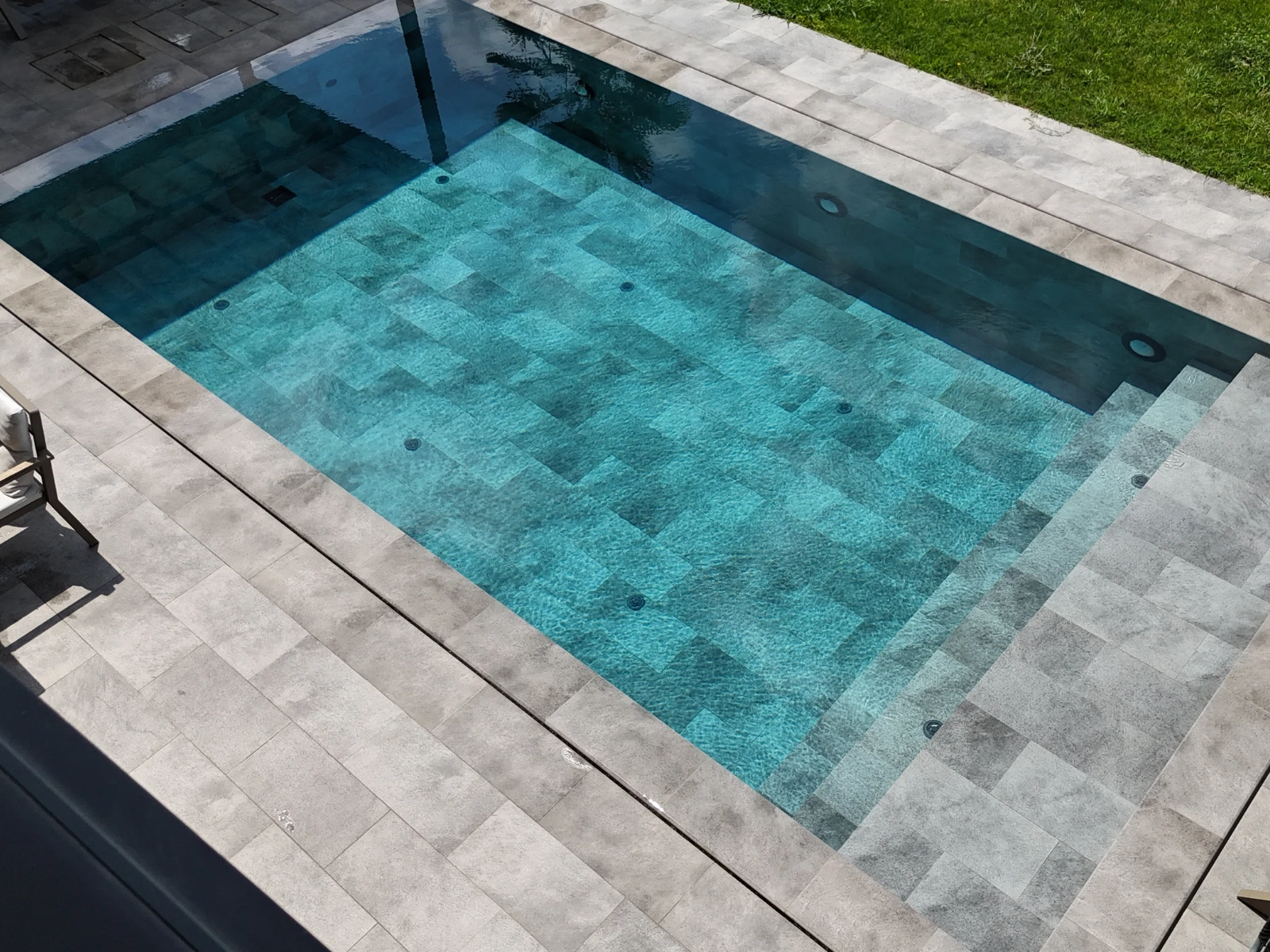 Sapanca’da konumlanan villanın havuz alanı çevresindeki modern mimariyle uyumlu sakin bir ton paleti üzerine kurulu. Antique Grey Serisi ile Pool Garden Grey ürünlerinin aynı yüzey dilinde buluşması havuz gövdesiyle teras kısmı arasında göze çarpmayan ama güçlü bir bağ kuruyor. Gri tonların birbirine yakın fakat dokusal olarak farklı yapısı alanın bütünlüğünü bozmadan derinlik hissi yaratıyor. Havuz içinde kullanılan Antique Grey Serisi suyla temas ettiğinde daha maviye çalan bir yansıma üretiyor. Farklı ebatlarda yerleştirilen karolar, yüzeyde hareketli bir doku oluşturuyor; özellikle güneş ışığının dik geldiği saatlerde bu doku suyun üzerinde ince bir desen gibi beliriyor. Villanın mimarisinin sade çizgileri düşünüldüğünde, bu yüzeyin kontrollü dinamizmi alanı canlı tutuyor. Teras bölümünde tercih edilen Pool Garden Grey porselen kaymazlar, dış mekan kullanımının gerektirdiği sağlamlıkla birlikte güvenli bir yürüyüş hattı sağlıyor. Gri tonun doğal taş hissi veren dokusu, peyzajla birleştiğinde oldukça dengeli bir atmosfer yaratıyor. Havuz kenarındaki geçişler için kullanılan Pool Garden Grey çizgi taşma karo ve taşma tutamak parçaları ise hem teknik işlevi yerine getiriyor hem de yüzeyin sürekliliğini koruyor. Bu elemanların kesintisiz bir hat oluşturması, havuzu çevreleyen platformu daha düzenli gösteriyor.
