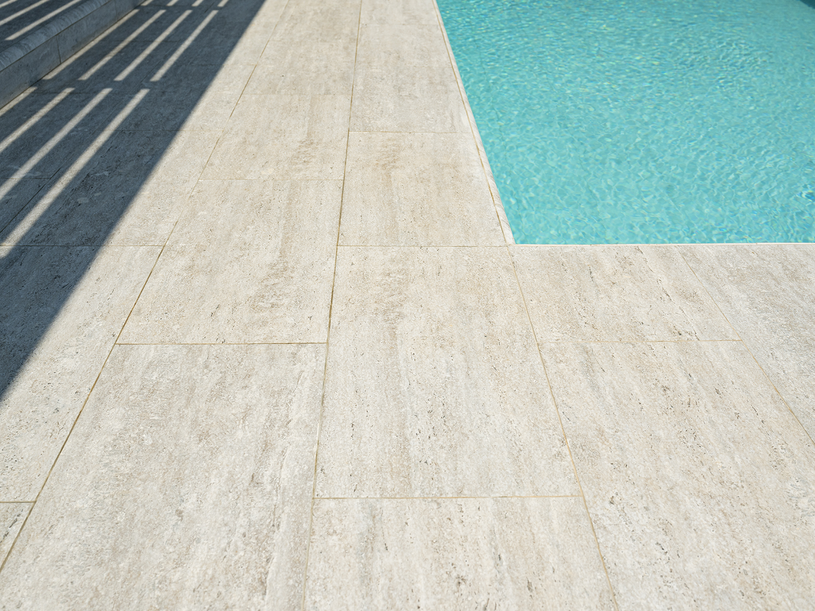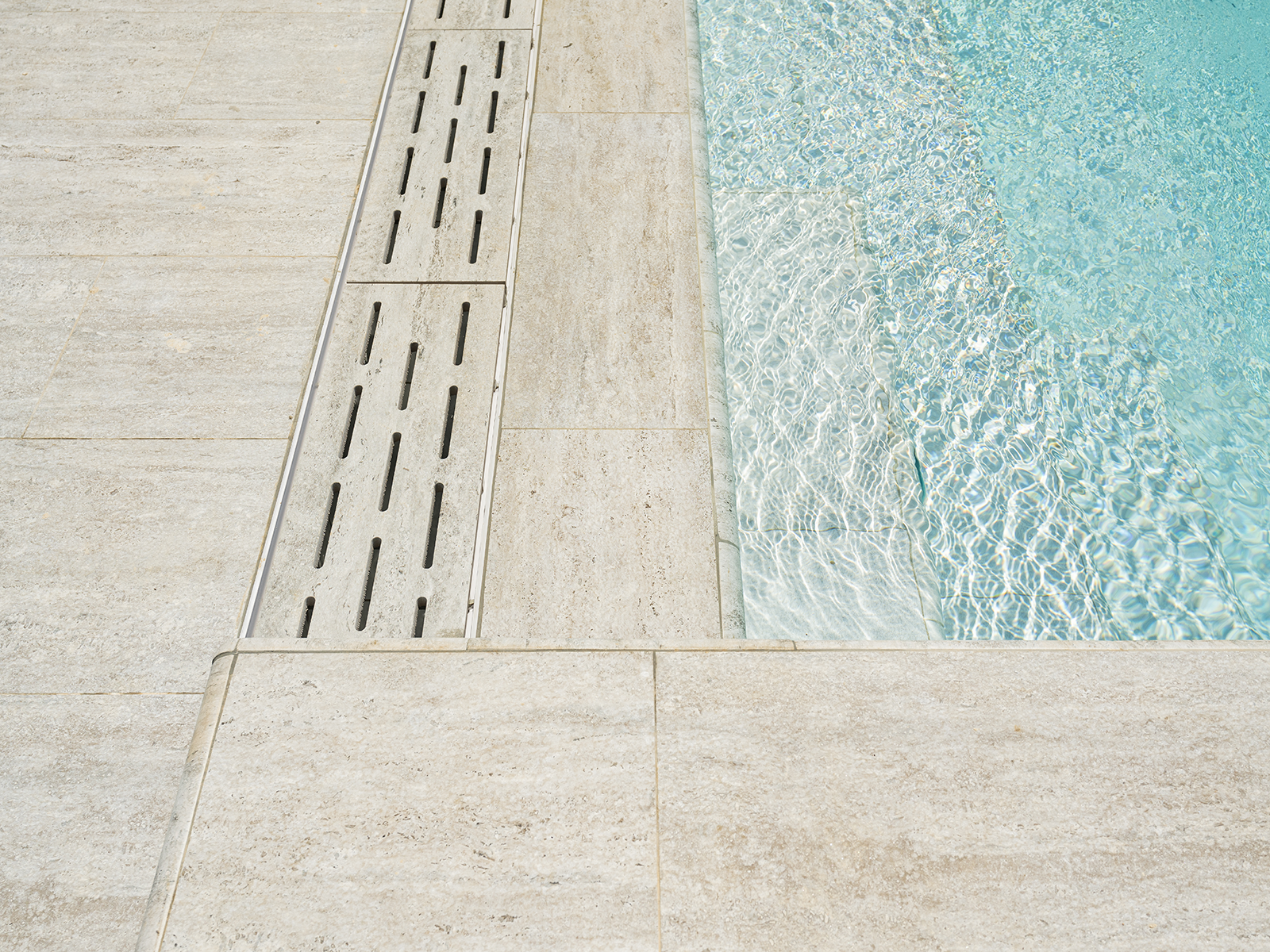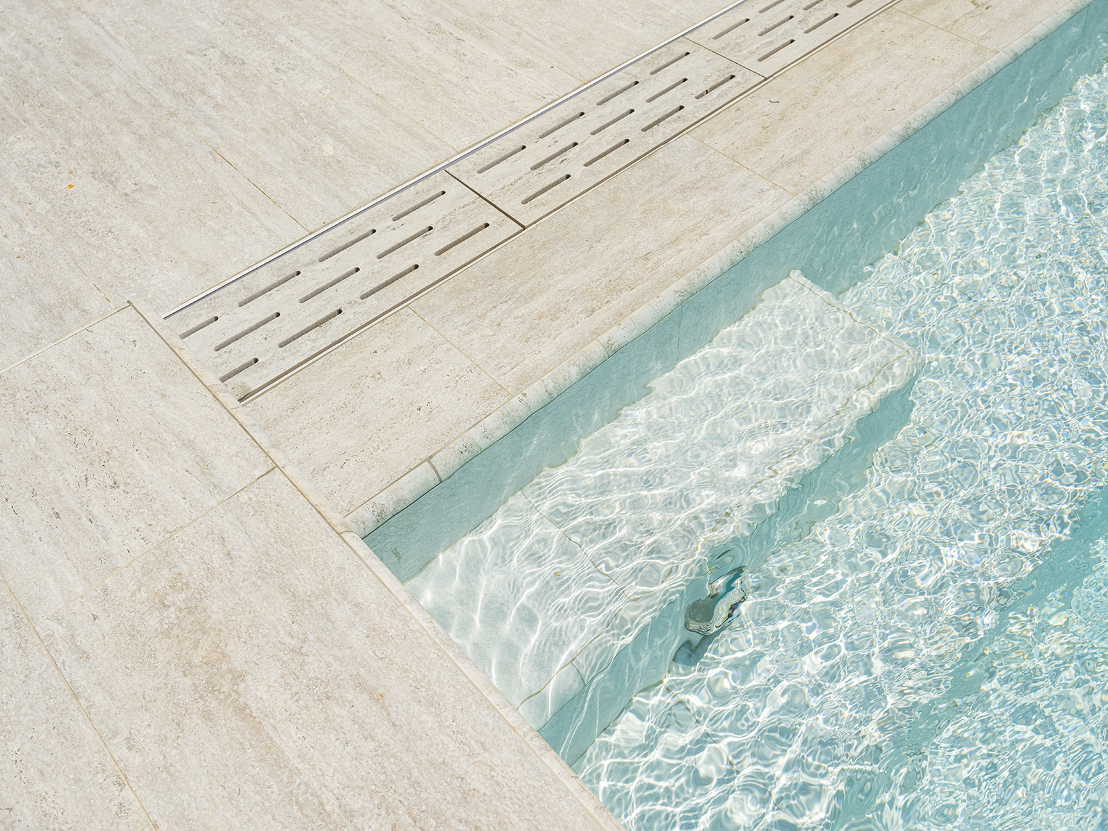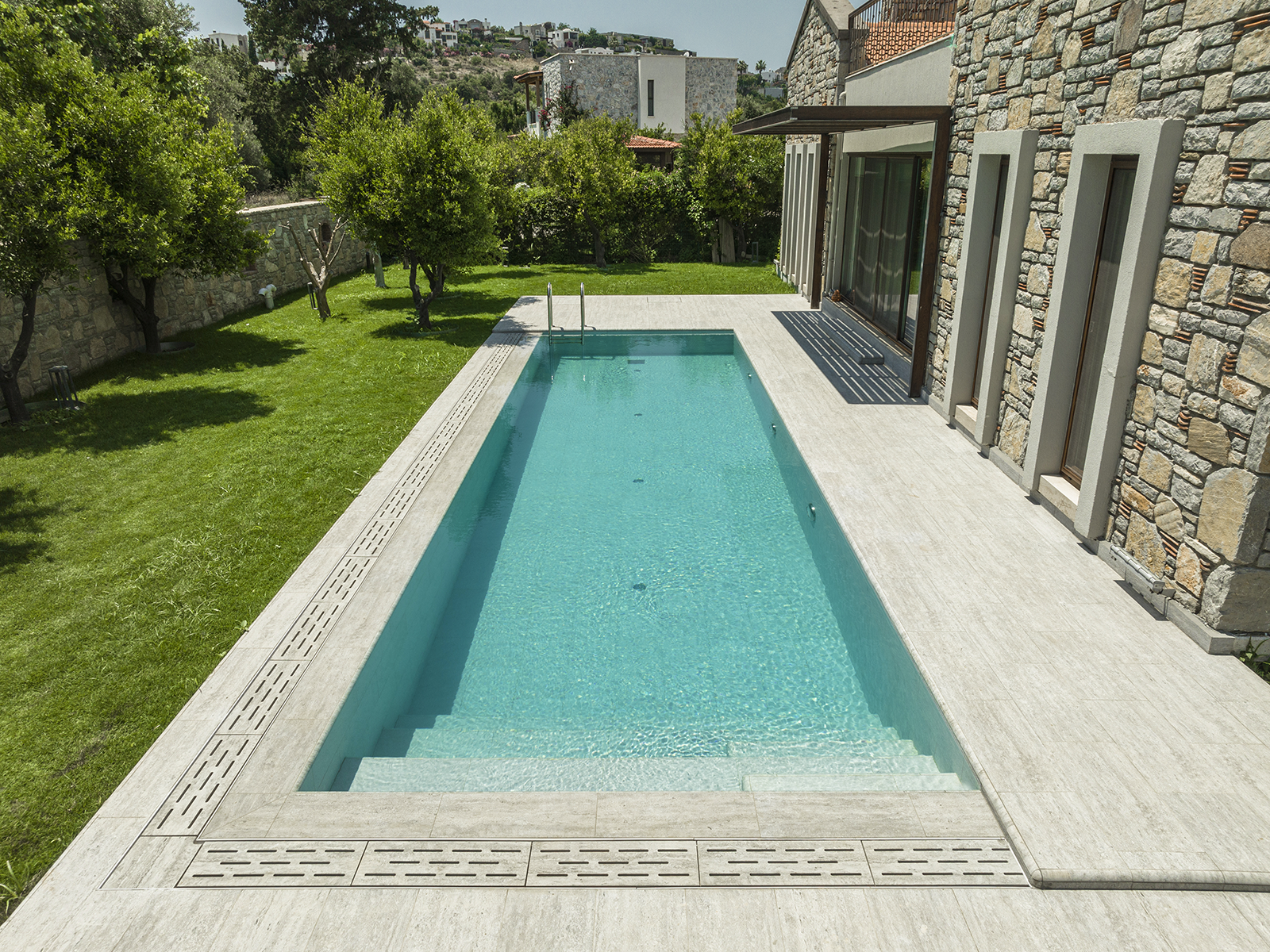 Bitez’de konumlanan villa havuzu projesi, yalın çizgilere sahip mimari yapıyı Serapool’un zarif tasarım diliyle buluşturuyor. Snow White serisi, saf beyaz tonlarıyla mekâna ferahlık ve optik genişlik kazandırırken, suyun berraklığıyla bütünleşen doğal bir atmosfer yaratıyor. Silver Traverten porselen teras kaymazları, yüzeyde sofistike bir taş dokusu sunarak çevre düzenlemesine lüks bir geçiş sağlıyor. Ürünlerin %0,5’in altında su emme oranı, UV ışınları ve kimyasallara karşı dayanıklılığı sayesinde uzun ömürlü kullanım sunuluyor. PTV ≥ 45 kaymazlık değeri ile ıslak alanlarda güvenlik artırılıyor. Tüm bu detaylar yalnızca yüzme konforu değil; estetik derinlik, fiziksel güvenlik ve yaşam alanında bütüncül bir lüks algısı yaratıyor.