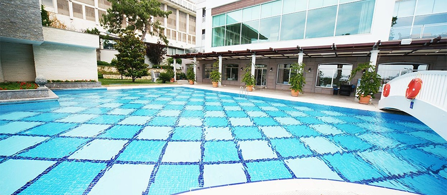 Гостиница Kilikya Palace объединяет архитектурное величие с профессиональными фарфоровыми решениями Serapool в обширной зоне бассейна. Противоскользящая плитка Борт Петит Карре Копинг с узорчатой текстурой придаёт поверхности ритмичную динамику. Керамогранитная мозаика для бассейна, объединяясь с прозрачностью воды, создаёт сильное визуальное единство. Плитка для бассейна имеет коэффициент водопоглощения ниже 0,5%. Обеспечивает превосходную устойчивость к УФ-излучению, химическим веществам и термическим шокам. Значение противоскольжения PTV ≥ 45° гарантирует максимальную безопасность в зонах интенсивного использования. Борт Петит Карре Копинг изящно очерчивает край бассейна. Фарфоровые внешние угловые элементы обеспечивают эстетическую и функциональную гармонию в переходных зонах.