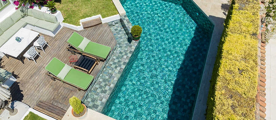 Вдохновлённая природой серия Piazza Green придаёт зоне для плавания эстетичную атмосферу с умиротворяющими зелёными тонами и текстурой натурального камня. Таким образом создаётся спокойное жизненное пространство, гармонирующее с ландшафтом. Плитка из 100% фарфора с водопоглощением менее 0,5% обеспечивает долгий срок службы. Обладает высокой стойкостью к УФ-лучам, химическим воздействиям и термическим шокам. Значение противоскользящей поверхности PTV ≥ 45 гарантирует максимальную безопасность на влажных участках. Противоскользящие ступени из фарфора и фарфоровая Бортовая плитка придают зонам перехода эстетическую целостность и функциональную ценность. Это решение создаёт не просто зону для плавания, а переосмысляет опыт роскошной жизни, обеспечивая единство эстетики, безопасности и комфорта.